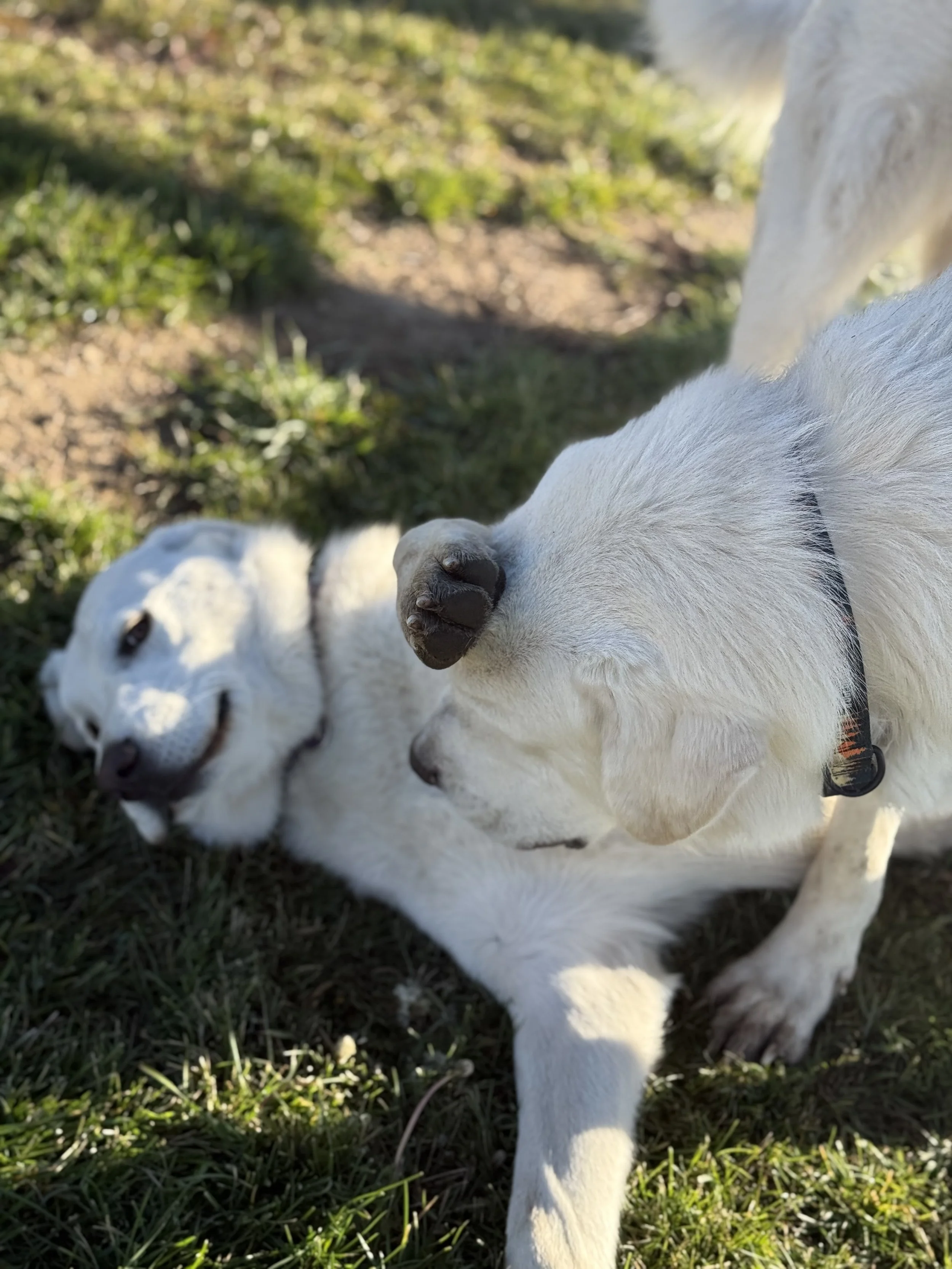 Hope and Dakota came to us from two separate situations. Roughly 2-3 year old Hope was surrendered by a rancher in Utah after a couple years of harsh conditions and an unknown amount of litters. We were able to get her to Unega, and around the same time we moved Mr. Dakota into the same section with her.
